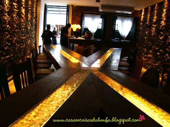 Na foto acima dá pra ver o mezanino, a parede de pedras, os tijolos aparentes e a vedete mesa em “X”. A peça é realmente linda, só não sei se é muito prática. O melhor é chegar cedo e tentar conseguir um lugar em uma das quatro extremidades porque o miolo é bem apertadinho e, se o bar estiver lotado, imagino que seja um pouco difícil sair para dar um pulinho no banheiro, por exemplo.