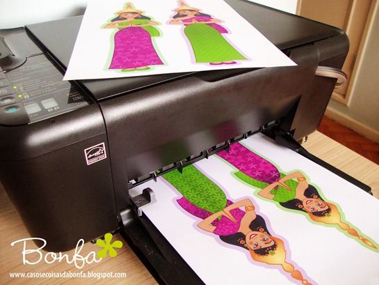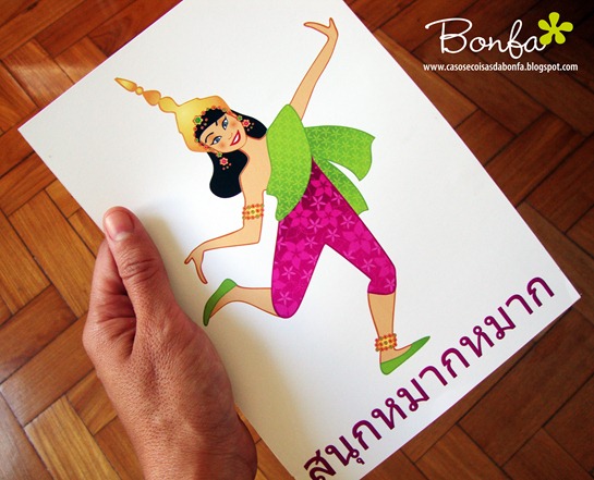 A primeira coisa que fiz foi imprimir as bonequinhas tailandesas que criei para serem as mascotes da festa. Seguindo a sugestão do meu amigo Wagner Campelo, eu coloquei um contorno grosso em torno das ilustrações para que fosse mais fácil recortá-las.
