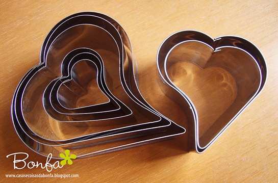 Comprei os cortadores da foto acima na seção de casa do HORTIFRUTI e, a princípio, eu havia imaginado usar somente o maior tamanho para cortar os pães. Pensando melhor, achei que seria mais divertido aproveitar todos os moldes e foi o que fiz.