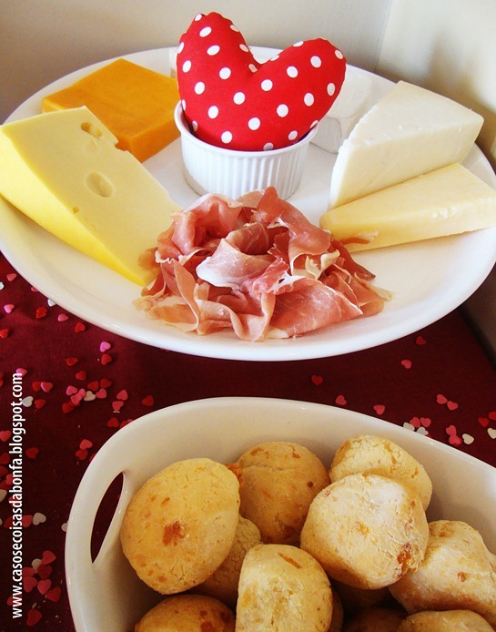 No meio do prato alto com queijos comprados no ZONA SUL (Maasdam, Brie, Cheddar, Grana Padano e Chèvre Holandês) e presunto cru, coloquei um potinho com um coraçãozinho de tecido que ganhei da TANIA FORTI. Achei que tinha tudo a ver com a ocasião. Adoooooro os pães de queijo do HORTIFRUTI com a casquinha craquelada, que me lembram os originais de Minas.