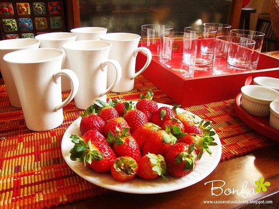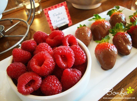 Essa era a parte mais gostosa do buffet, na minha opinião!!!! Nem acreditei quando encontrei framboesas no HORTIFRUTI e tratei de comprar uma caixinha (uma só porque são caaaaaaras!), além de morangos bem vermelhinhos. Fiz o fondue de chocolate misturando uma barra do tipo amargo com uma caixinha de creme de leite e um pouco de Whisky pra dar um tchan…