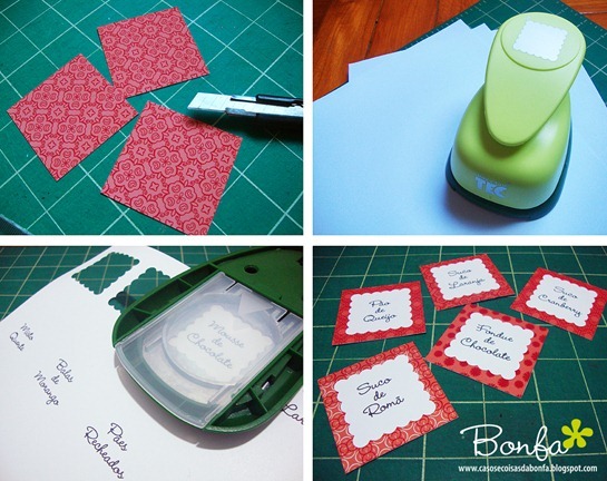 Cortei os papéis em quadradinhos usando um estilete e, com o auxílio de um cortador especial com bordas trabalhadas comprado na papelaria JARDIM LARGO DO MACHADO, confeccionei o miolo das plaquinhas contendo os nomes dos comes & bebes. A primeira vez que usei essa peça, me enrolei e não consegui um encaixe perfeito, mas depois que conversei com minha prima Ju, descobri que o certo é usar seu lado inverso, transparente, para posicionar corretamente o que se deseja cortar. Vocês podem observar esse passo a passo no mosaico de fotos acima.