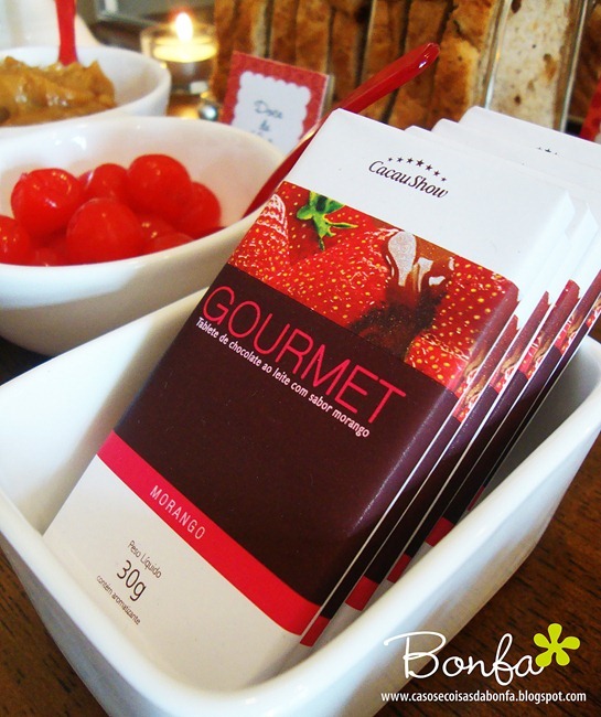Essas barrinhas de chocolate ao leite sabor morango também vieram da CACAU SHOW e uma mantegueira/porta-adoçante de porcelana serviu como base improvisada para acomodá-las.