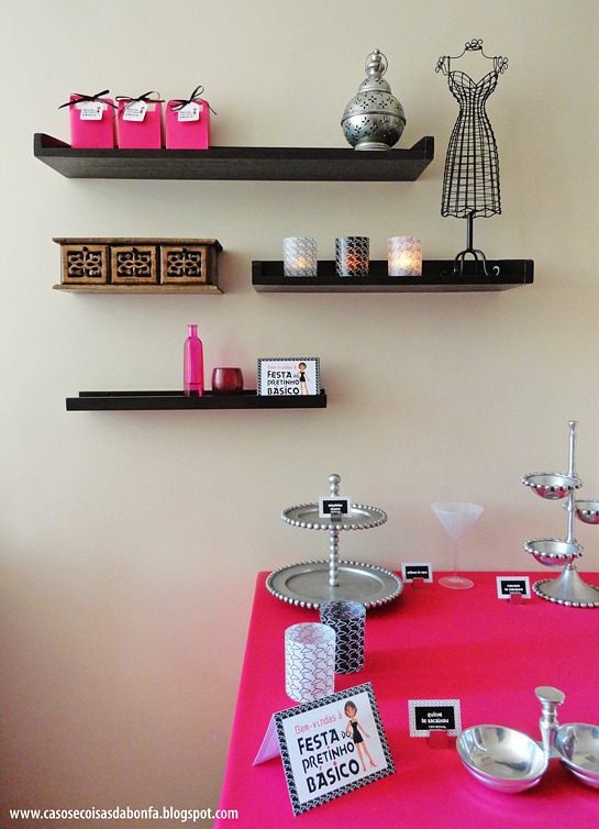 Resolvi testar a sugestão, mas como as minhas prateleiras estão fixadas a uma altura desconfortável para servir comidinhas, pensei em adaptá-las ao contexto da festa, substituindo os objetos decorativos do dia a dia pelos que vocês verão a seguir.