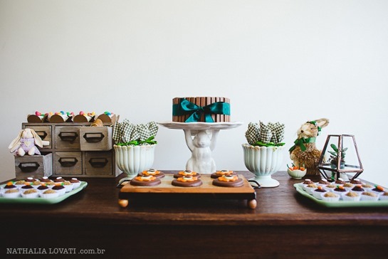 Um potinho vintage encontrado no louceiro de uma amiga querida, um coelho de louça e cenouras de uma outra celebração completam o cenário e trazem personalidade ao evento.