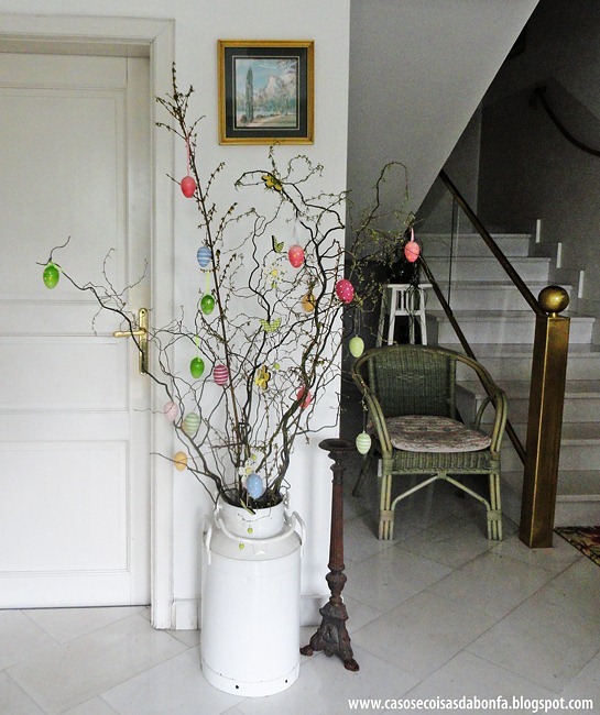 Na agência de turismo onde alugamos um barco à remo para chegar até a igrejinha, também havia uma Árvore de Páscoa inserida em um recipiente grande para leite pintado de branco. Além dos galhos secos e dos ovos, esse exemplar foi decorado com borboletas e flores recortadas em EVA.