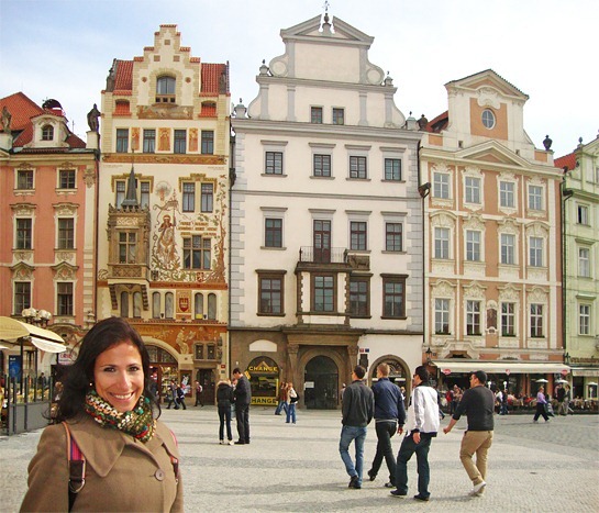 Amei a construção da foto acima que aparece logo atrás de mim. Ela é conhecida como Casa Storch e é decorada com uma ilustração de São Wenceslau a cavalo. Achei linda a arquitetura da fachada com seus arcos, suas pequenas janelas e o balcão todo trabalhado.