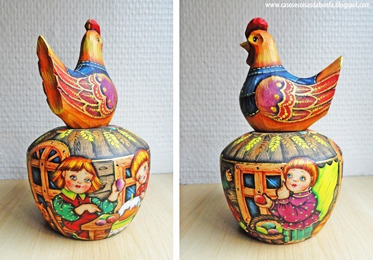 Foi em Riga que comprei um dos souvenirs mais bonitos dessa viagem! A caixinha de madeira tem uma galinha decorando sua tampa, ilustrada com muitos detalhes. Em sua base, há uma série de personagens sentados em torno de uma mesa pintando ovos de Páscoa.