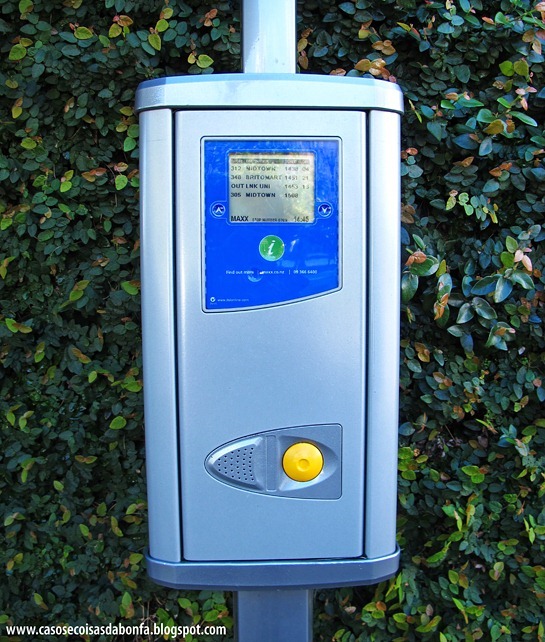 No ponto de ônibus, encontramos esse totem curioso: seu visor mostrava os ônibus que estavam a caminho e exibia informações sobre o horário programado de chegada e o horário real/atualizado. A maioria estava um pouco atrasado, mas achei esse recurso bem legal.