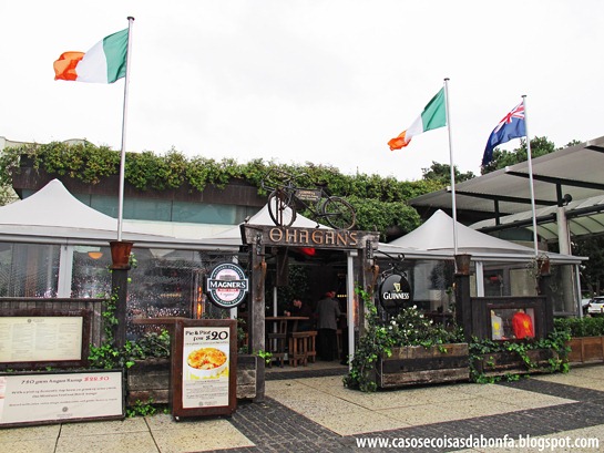 Eu também pedi um filé com molho de vinho tinto e batatas fritas. Hummm, estava tudo delicioso!!!!! Só não gostamos do vinho que pedimos, fraquíssimo e aguado. Na verdade, não tivemos sorte com os vinhos do novo mundo. Sei que existem várias marcas boas por lá, mas essas eram caríssimas. Os rótulos com preços acessíveis não nos agradaram. Uma curiosidade é que tanto na Austrália quanto na Nova Zelândia, todas as garrafas de vinho tem tampa de rosca. Não vimos nenhuma com rolha, como estamos acostumados no Brasil.