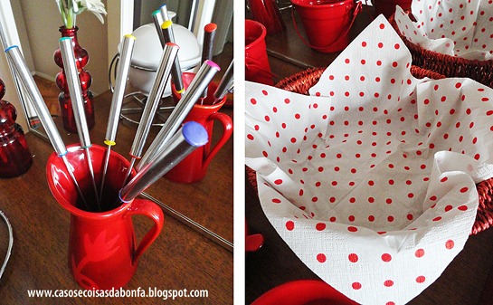 Coloquei seis palitinhos para fondue em uma pequena jarra comprada na ETNA e usei um dos guardanapos que sobraram do CHÁ ENTRE BLOGUEIRAS: UMA TARDE EM PARIS no ano passado para forrar uma cesta de palha vermelha.