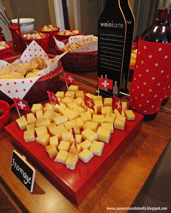 Eu não tinha nenhuma tábua de madeira vermelha na qual poderia acomodar os cubinhos de queijo, então lembrei de uma pequena bandeja nessa cor e tive a ideia de virá-la ao contrário. Dessa forma, a peça ganhou uma altura interessante e serviu como base para a variedade de queijos suíços que servi aos convidados. As bandeirinhas fofas que eu estava louca para usar foram presente da amiga Paula Guimarães, de Recife. Obrigada, Paula!!!!!