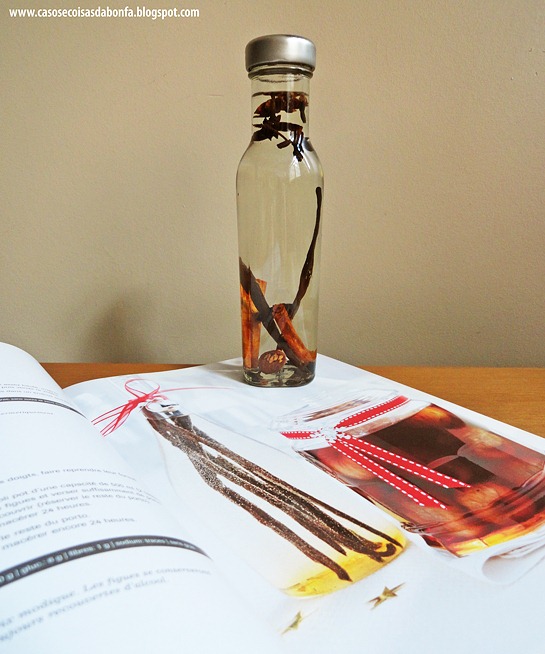 Na edição de Natal do ano de 2009, ela publicou uma receita de essência de baunilha feita com vodka e favas. Resolvi aproveitar a dica e acrescentar o anis estrelado, dois bastões de canela, um punhado de cravo e noz moscada. Não sei qual será o resultado, mas na receita original é necessário esperar um mês para a bebida incorporar o sabor da baunilha. Sendo assim, no mês que vem eu volto aqui pra contar se a minha experiência deu certo!!!!!