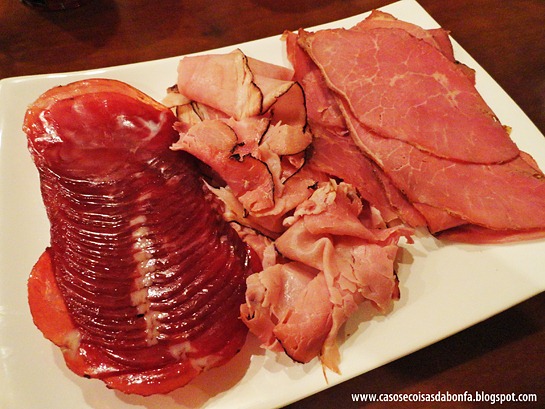 Nos pratos brancos da mesa de centro, servi copa, presunto alemão e pastrami.