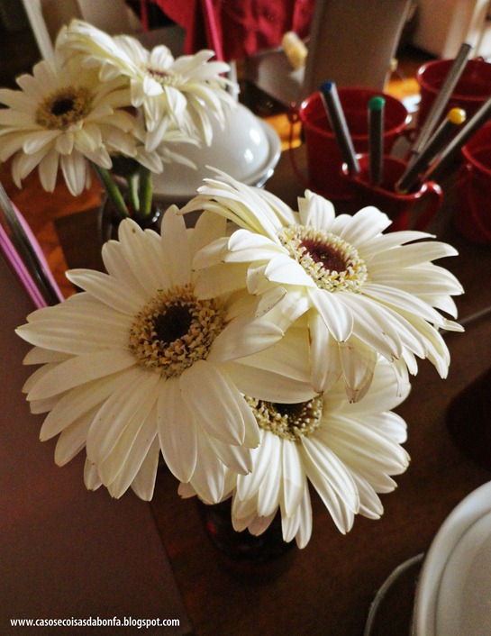 Como adoro flores frescas, mas só as compro em dia de festa, aproveitei a ocasião e inseri três gérberas brancas em um vaso de vidro vermelho.