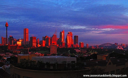 Vista do nosso quarto de hotel ao amanhecer em Sydney, Austrália