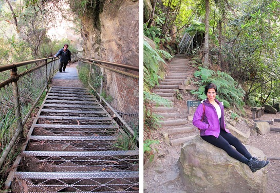 As trilhas dentro do Jamison Valley são muito bem sinalizadas e de fácil acesso, mas algumas delas exigem um certo grau de condicionamento físico. Depois de descer os 900 degraus, tivemos que subir uma escada do mesmo tamanho!
