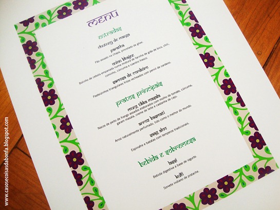 Em seguida, liguei o computador e comecei a esboçar o menu, de olho nas opções do ORIENTHAI. Fotografei a almofada que mostrei AQUI e que possui a mesma estampa do caminho de mesa, porém mais miudinha, a fim de usar a padronagem como moldura do cardápio. Para escrever os nomes dos pratos, usei a fonte SAMARKAN NORMAL e terminei o trabalho inserindo a folha de papel especial para jato de tinta da PIMACO em uma base de acrílico transparente.