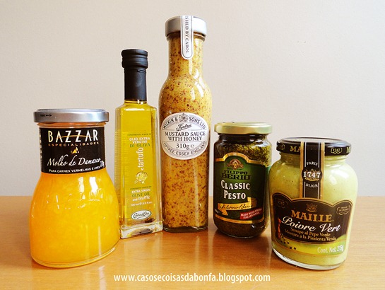 Vocês sabem que adoro experimentar molhos e temperos diferentes, né? Durante a semana passada, fui aos mercados FARINHA PURA e ZONA SUL para procurar matérias-primas a fim de preparar alguns canapés e encontrei as seguintes iguarias: molho de damasco (com a recomendação de ser usado em pratos com carnes vermelhas ou aves), azeite extra-virgem com trufas negras, molho de mostarda com sementes e mel, pesto de manjericão e mostarda Dijon com pimenta verde.