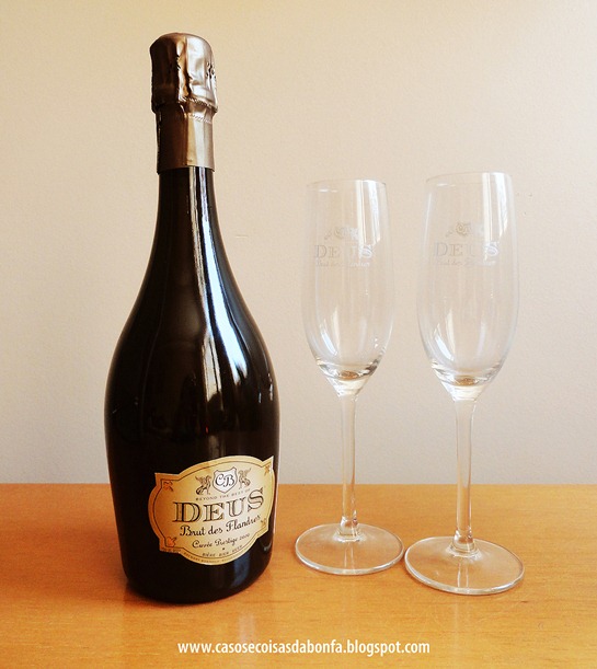A DEUS foi o meu presente para o Marcelo pelos nossos 16 anos juntos e eu optei por esse mimo porque sabia que ele não a compraria por conta própria. Não sei exatamente a razão de ela ser tão cara no Brasil, já que custa surpreendentes 20 euros, no máximo, na Bélgica. O Marcelo continua preferindo a modalidade WEISS (cerveja de trigo), mas assim como eu, valoriza essas experiências e “extravagâncias” que fazemos de vez em quando e gostou do presente. As taças com a marca da cerveja impressa foram outra extravagância minha, mas não aconselho vocês a as adquirirem. Outras taças do tipo flûte produzem o mesmo resultado. Eu só comprei as peças porque queria marcar essa data especial de alguma maneira.