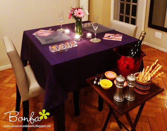 Nos dois jantares românticos mais caprichados que organizei em casa, comprei alguma coisa pronta: ou o prato principal ou a sobremesa. Essa foi a primeira vez em que preparei tudinho do início ao fim, desde os canapés de entrada, passando pelo prato principal (minha melhor experiência culinária até hoje) e terminando na sobremesa.