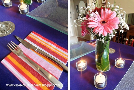 Selecionei para nosso jantar especial um guardanapo listrado com cores quentes: rosa, liás, laranja, vermelho, vinho e branco. Por esse motivo, fui à floricultura munida dessa escala de cores, além de um copo de água que escolhi para abrigar as flores. O rapaz que me atendeu foi muito gentil e finalizou o arranjo de gérberas coloridas com uma folha de jiboia enrolada dentro do copo, o que deu uma textura interessante ao conjunto. Fiquei muito feliz com o resultado e elogiei bastante a criação dele.