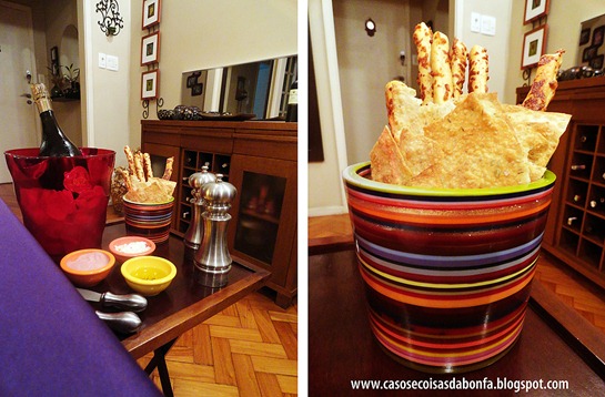 Na mesinha lateral, coloquei a petisqueira com grissinis e pizza branca, além do azeite aromatizado com trufas negras, do cream cheese com nozes da marca francesa Prèsident (MARAVILHOSO!!!!) e do patê de foie gras.