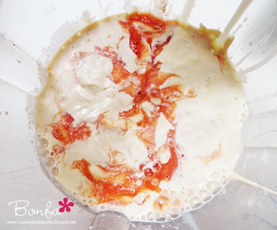 Misturei o creme de leite, o leite condensado e o suco concentrado no liquidificador batendo tudo. Achei que a mistura ficou mais líquida do que o necessário para que adquirisse a consistência de mousse depois de gelada e fui acrescentando alguns pedaços de goiabada cascão. Minha tentativa de corrigir a sobremesa deu certo, ufa!!!!