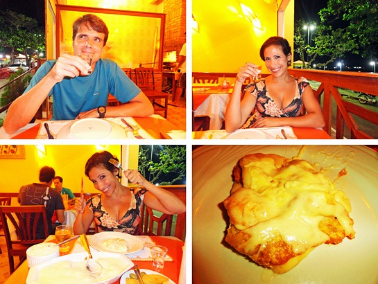 À noite jantamos no restaurante BARLAVENTO, cuja especialidade são frutos do mar e pizza no forno à lenha. A relação custo x benefício é boa e a comida é gostosa. Eu pedi um prato de camarões gratinados com molho de queijo. Veio muuuuito queijo e uma fartura de camarões.