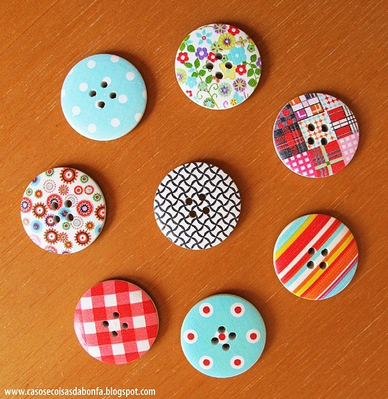 Voltando aos botões coloridos do título do post, só os encontrei na filial da Rua Sarandi e gostei deles logo de cara! Havia uns dez ou doze modelos, mas comprei somente oito, um de cada padronagem, com o objetivo de customizar alguma jaquetinha simples que eu tivesse em casa. Paguei 1 real por cada botão.