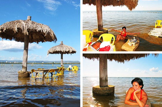 A praia estava cheia, mas conseguimos encontrar um lugar legal para sentar e beliscar alguma coisa. Adorei essas tendas brancas que ficam dentro da água morninha… que delícia!