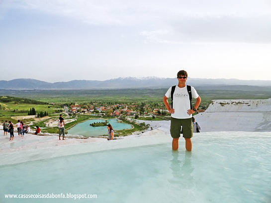 Pois é, gente, infelizmente, as piscinas naturais não existem mais!!!!! O que eu vi nas fotos tiradas há quase vinte anos não estava mais lá e confesso que isso me deixou bem triste em um dado momento do passeio. Alguns amigos já tinham me alertado para não basear as minhas expectativas nos cartazes das agências de turismo, porque hoje em dia a região está muito mais seca… tudo bem, até aí eu já imaginava. Mas o problema é que o “mais seco” é, na verdade, “quase totalmente seco”, e nem é mais possível penetrar na área das antigas piscinas naturais. Na minha opinião, o fascínio e a exuberância de Pamukkale provinha justamente do fato de as piscinas terem sido esculpidas pela natureza, sem nenhuma intervenção do homem.