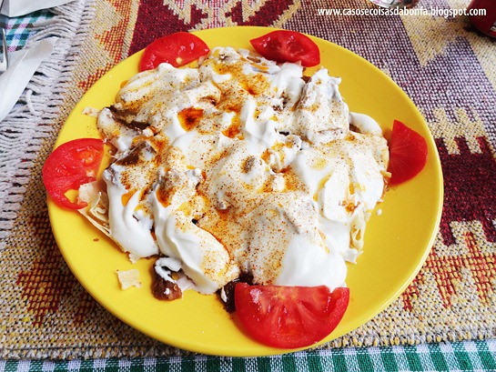 Escolhemos uma mesa perto da varanda e eu pedi novamente o Iskender Kebab, composto por fatias finas de carneiro servidas com molho de tomate fresco, iogurte e pão pita cortado em tiras. Esse não estava tão gostoso quanto os que comemos em Selçuk, mas não era ruim.