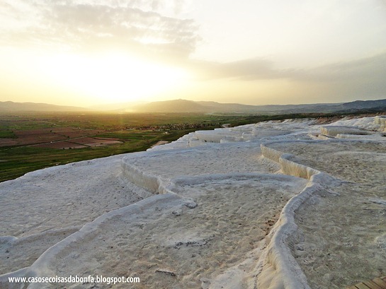 Subimos novamente, escolhemos um bom lugar e esperamos o pôr do sol, contemplando lá de cima a pequena localidade de Pamukkale e o extenso vale ao seu redor.