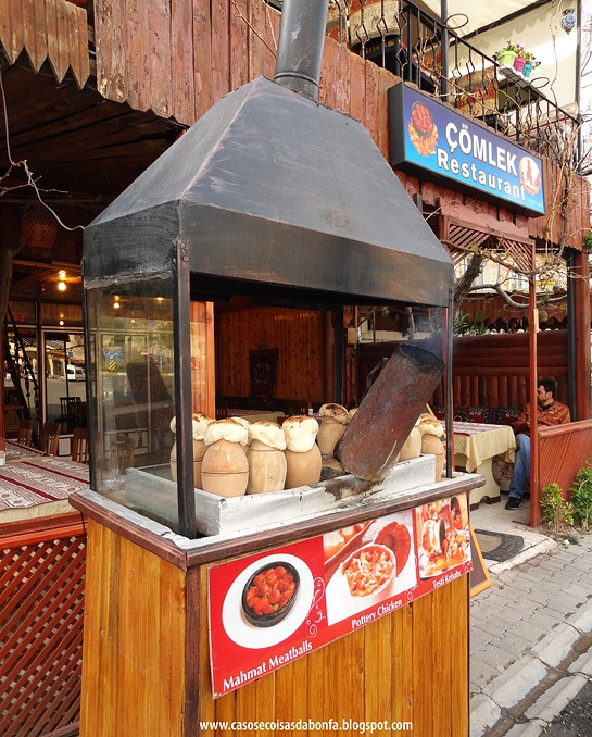 Foi em Goreme que vi pela primeira vez o kebab feito em potes de barro, que ficam dentro de um forno bem quente com um pedaço de pão em sua extremidade. Apesar da curiosidade, deixamos para experimentar a iguaria em Istambul, quando aproveitei a oportunidade para gravar um video mostrando como o pote é quebrado com uma espécie de faca não afiada na hora de servir.