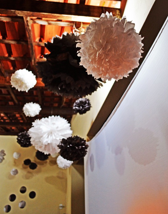 Logo que tive a idéia de fazer uma festa com o tema: “Branco e Preto” falei com minha irmã Raquel (habilidosíssima) que imediatamente se prontificou em me ajudar... Fez os convites, as tags de identificação dos pratos e da decoração, os adereços (óculos, bocas, drinks...), os pompons de papel crepom, além de me ajudar na organização dos móveis e dos pratos. Não posso deixar de mencionar que meu cunhado, marido dela e meu marido também ajudaram muito!