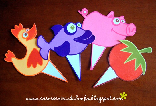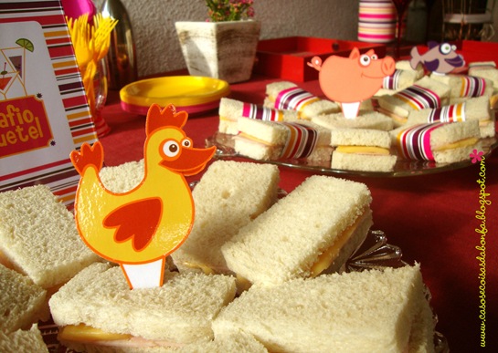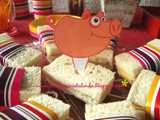 Preparei três tipos de sanduíches no pão de forma sem casca e envolvi-os com uma faixa do papel listrado, colando as extremidades com fita dupla-face, como disse que faria nesse post. Adorei a ideia da revista Tout simplement Clodine e precisava adaptá-la à minha festinha de alguma maneira. Eis aí minha versão para os sanduíches embalados! Depois de prontos, dividi os sanduíches de acordo com os recheios que foram utilizados e organizei-os da maneira que aparece na foto acima, espetando cada “bichinho identificador” na travessa que continha os sanduíches correspondentes.