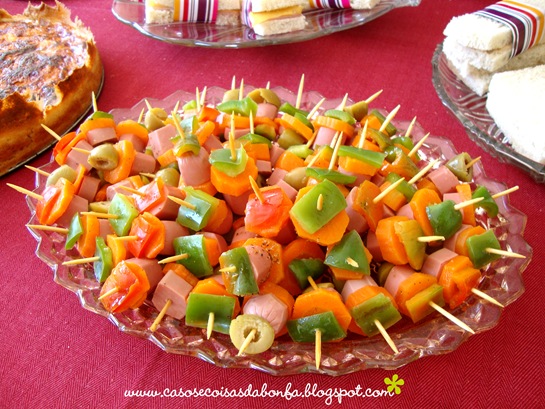 A Andreia também ressucitou a moda da “sacanagem”, que são esses espetinhos muito comuns em festinhas das décadas de 60, 70. Super fáceis de fazer, eles dão um colorido especial à mesa. Nesse caso ela usou pimentão verde, cenoura cozida, azeitona, tomate e salsicha.