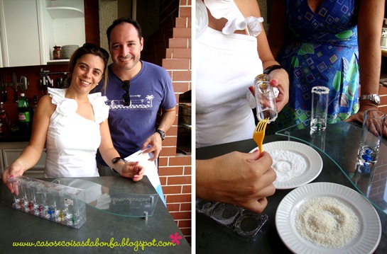 Para decorar a borda do copo, Paula separou dois pratinhos de sobremesa onde colocou sal e côco ralado. Ela molhou a borda dos copos delicadamente e emborcou-os nos pratinhos para que o resultado fosse o da foto abaixo: perfeito e delicioso!