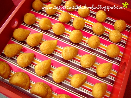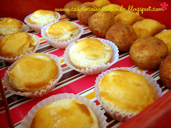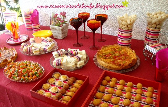 Minha avó Carmota, já famosa por aqui, levou esses salgadinhos que servi em bandejas vermelhas quadradas. Todas foram forradas com o mesmo papel de presente e recobertas com papel contact transparente para protegê-lo das manchas de gordura.