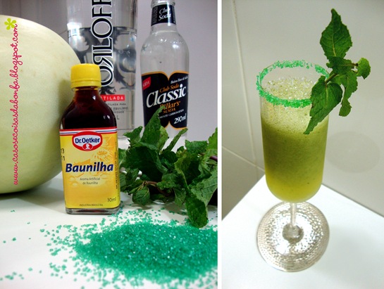 O coquetel levou melancia, vodka Absolut Pepper e gelo. Para decorar a borda, fiz o mesmo processo que a Paula, só que usei açúcar colorido ao invés do sal e do côco. A decoração do drink foi simples, usei um canudinho da mesma cor do açúcar e colei nele uma bandeirinha feita com o papel listrado.