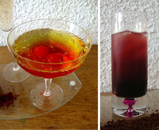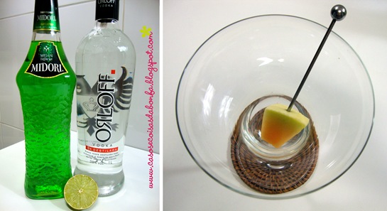 O drink da esquerda foi preparado pela minha mãe e misturou espumante brut, licor de melão Midori e cerejas as marraschino com um pouquinho do líquido para dar um efeito degradê interessante à bebida, que foi servida numa taça de champagne estilo retrô.