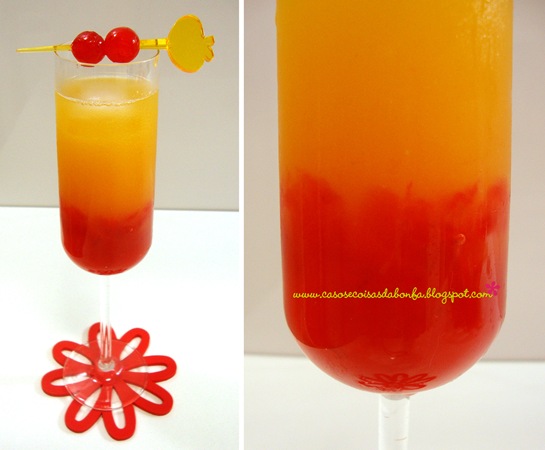 O drink da esquerda foi preparado pela Karla, do blog Criative-se, e levou whisky, guaraná e água de côco cuidadosamente colocados na taça para que não se misturassem e tivessem esse efeito trifásico. Mesmo não gostando de whisky, acho que a mistura de ingredientes deixou a bebida tão harmoniosa que eu nem percebi a presença do álcool.
