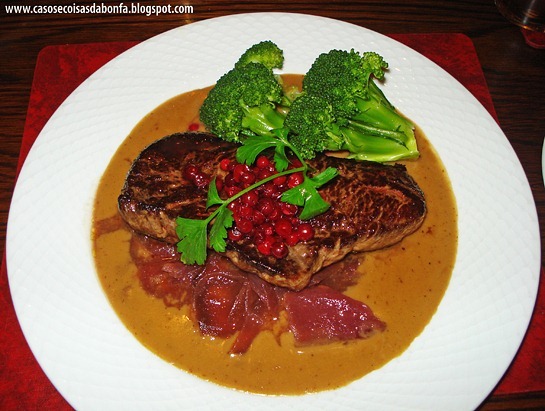 Minha mãe pediu um salmão que estava fresquinho e bem rosado e o Marcelo optou por alce, que assim como a rena, tem uma das carnes mais tenras e saborosas que já experimentei.