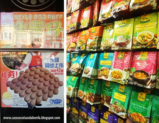 A gente sente que o mundo está concentrado em alguns quarteirões, é bem interessante. As lojas exibem uma infinidade de temperos e comidinhas exóticas, como as das fotos acima e abaixo. O que será esse quadradinho cheio de bolotas da primeira foto à esquerda, alguém desvenda esse mistério? No cartaz, dá pra ler H.K. STYLE EGG PUFF. Parece chocolate, mas leva ovo… curioso, né?
