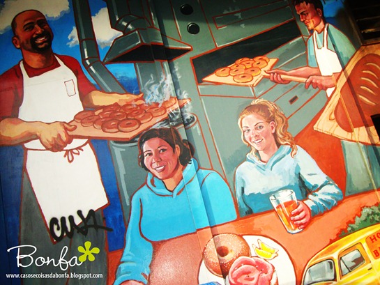 Vocês sabem que adoro decoração, design e ilustração, né? Não me interesso por esses assuntos só porque fazem parte da minha profissão, mas porque fazem parte da minha vida como um todo. E não havia como deixar de reparar nesse painel maravilhoso pintado nos fundos (!!!!) de uma padaria. Achei o trabalho sensacional e adoraria descobrir o nome do artista responsável pela obra!!!!