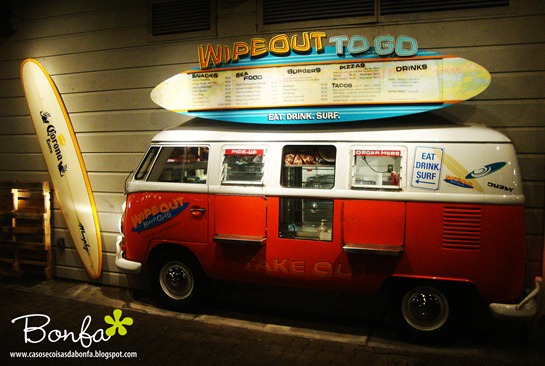Chegamos ao WIPEOUT no PIER 39 (lembram que mencionei o lugar na Parte I dessa série sobre São Francisco?). O restaurante tem como tema o surf e, além de deliciosos hamburguers, lula empanada e comida mexicana, possui drinks maravilhosos em seu cardápio. No primeiro dia, só passamos em frente ao local, mas na penúltima noite da viagem voltamos e experimentamos algumas delícias. Na foto acima, eu estava provando o Radical Raspberry Cosmo (Burnett's Raspberry vodka, Bols Red Raspberry, fresh lime juice in a sugar-rimmed glass), mas também não resisti ao Jim Beam Sour (Jim Beam, sweet & sour, orange Bitters and cherry syrup). Eu adoraria encontrar todos esses ingredientes no Rio para reproduzir as bebidas em casa. Percebi que a maior parte dos drinks que conheci nessa viagem eram azedinhos e eu adoro esse sabor!!!!!