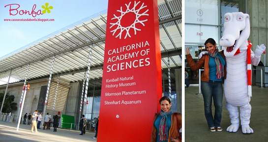 A CALIFORNIA ACADEMY OS SCIENCES também fica dentro do parque e abriga um museu de história natural, um planetário e um aquário. Se eu tivesse mais algumas (muitas) horas livres, teria entrado no complexo porque adoro esse tipo de atração. Infelizmente, o tempo passava rapidamente e precisei me contentar em posar ao lado do jacaré albino na porta de entrada.
