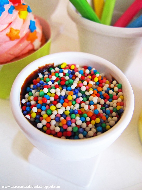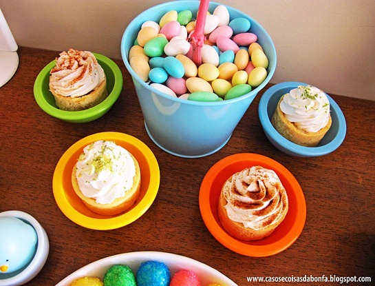 Nos porta-ovos também de melamina, comprado na Suíça, servi uma mousse de chocolate decorada com confeitos coloridos e intercalei essa sobremesa com os cupcakes de sabores diferentes.