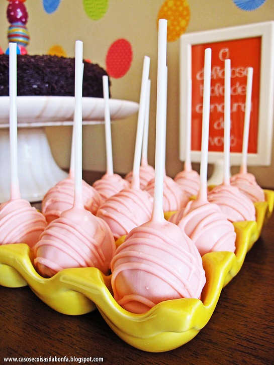 Os Cake Pops bonitos e suculentos são da TATIANA BONOTTO e parece até que ela sabia exatamente a medida da petisqueira em formato de caixa de ovos porque os docinhos se encaixaram nela perfeitamente!